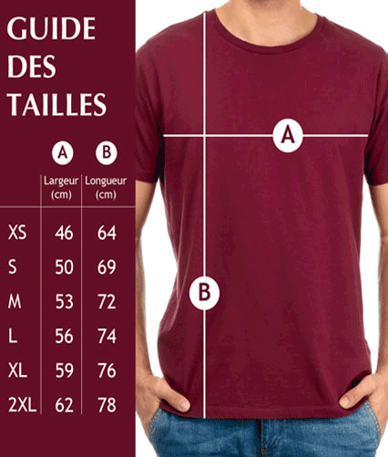 Pour commencer, choisissez un T-shirt de votre garde-robe dans lequel vous vous sentez à l’aise. Vous devrez prendre 2 mesures, tel que nous vous l’indiquons sur l'image ci-dessus pour déterminer votre taille.